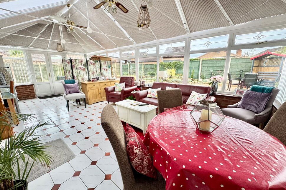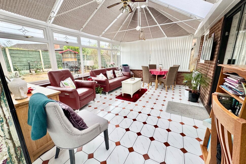 Entrance Hall, Reception Hall, Living Room, superb refitted 15ft Kitchen/Dining Room, stunning 25ft Conservatory. Two spacious Bedrooms, refitted Bathroom. Feature block set area to the front providing useful additional parking area. Extensive, yet low maintenance rear gardens, with large patio sections, pebbled areas with raised stocked borders, providing a variety of seating locations throughout the day, all enclosed with fence borders and enjoying a good degree of privacy not directly overlooked from the rear. Driveway to the front provides parking and access to the Detached brick Garage.