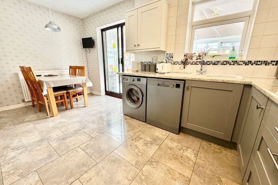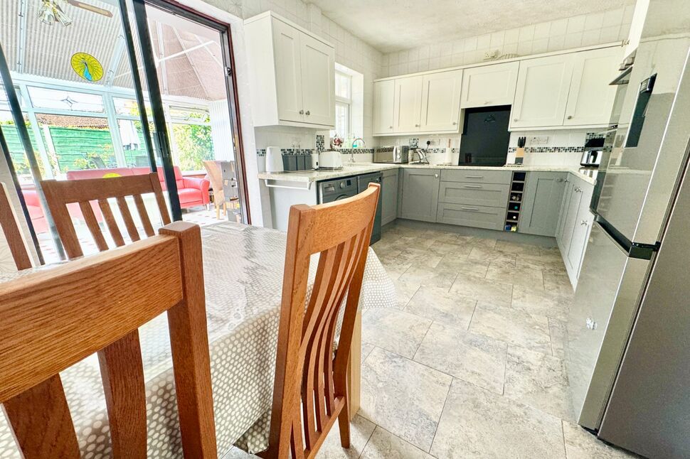 Spacious, refitted Kitchen, with a range of soft grey coloured wall, bas and drawer units with single drainer, one and a half bowl sink unit with mixer tap. Fitted Kenwood double oven, four plate induction hob with extractor, recess for dishwasher and washing machine. Part tiled walls, tiled floor, window to the rear, patio doors through to the Conservatory.