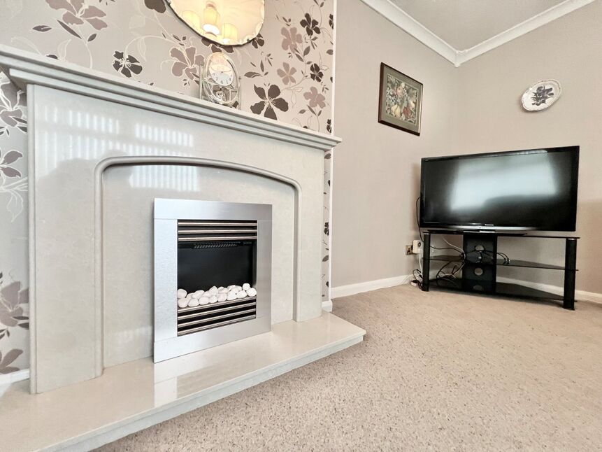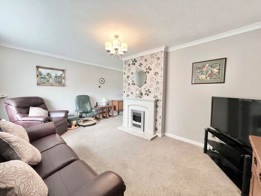 A well proportioned family lounge with ample light from the UPVC double glazed window to the front elevation, tasteful neutral decor with ceiling cornice and contrasting carpets and the focal point of the room being the marble fireplace and hearth with living flame effect electric fire.