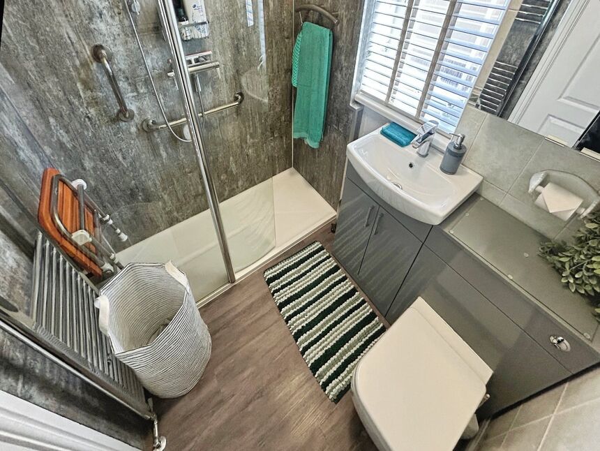 The shower room is fitted with splashbacks, wc, a wash hand basin, a chrome heated towel rail, walk in shower and a side facing PVCu double glazed window.