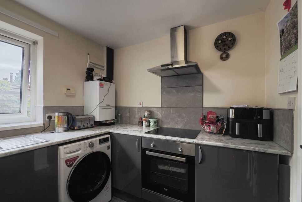 Well appointed kitchen fitted with a selection of wall, base and drawer units with modern grey cabinet doors. The units are complimented by expanses of light, granite effect counter tops giving the space a modern, stylish finish. The kitchen benefits from an integral electric oven with halogen hob over and extractor hood. Space is provided for a free-standing washing machine and fridge/freezer. A stainless steel sink and drainer sits beneath a double glazed window to the side elevation. With open sight lines to the living room, wall-mounted boiler and laminate flooring.