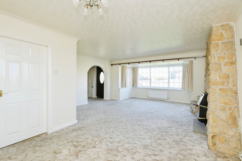 Spacious reception room that provides space for dining and entertaining with fitted carpet, feature fireplace, central heating radiator, side facing double glazed window and front facing double glazed bay window.