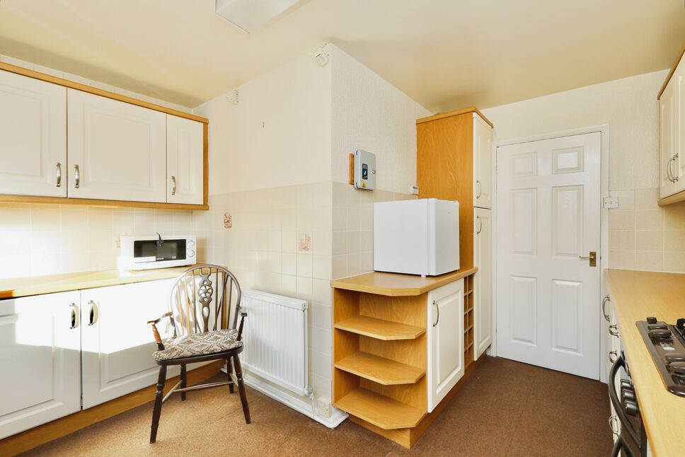 Briefly comprising; a range of matching eye level and base units, sink and a half with drainer and mixer tap, complimentary splash back tiling, integrated double electric oven, gas hob with cooker hood over, central heating radiator, carpet tiled flooring, side facing double glazed window and side facing door providing access to driveway.