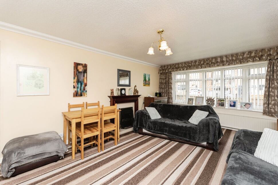 Feature fireplace surround with inset and hearth housing a fire. Central heating radiator, coving to ceiling and double glazed bow window overlooking the front elevation.