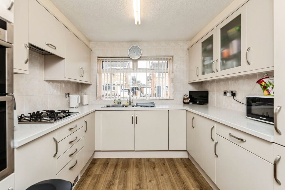 Range of base and wall cupboard units with work top surfaces incorporating a 1.5 bowl sink unit with mixer tap. In-built double electric oven, gas hob and extractor hood. Integrated fridge/freezer, tiled walls, laminate floor and double glazed window overlooking the front elevation.