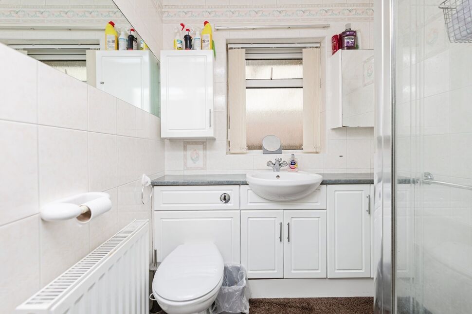 Walk-in shower cubicle, vanity wash hand basin and low level flush W.C. Fully tiled walls, central heating radiator and double glazed side window.