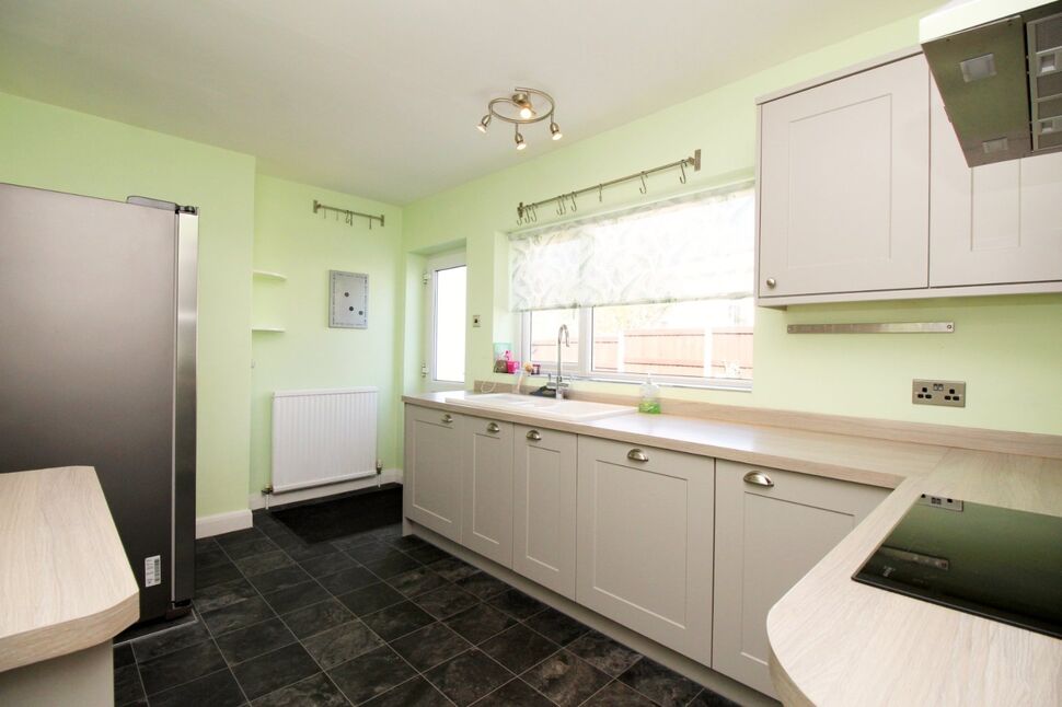 Fitted with a range of modern wall, drawer and base units with worktop over, one and a half sink with drainer, integrated oven with four ring Neff electric hob with stainless steel Neff extractor hood over, integrated dishwasher, space for American fridge freezer, radiator and uPVC double glazed window and obscure door giving access into the garden.