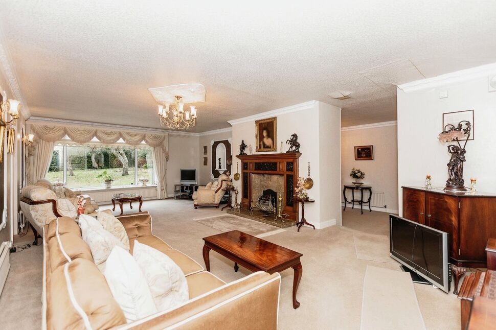 Feature fireplace surround with marble inset and hearth, coving to ceiling with rose, wall light points and two central heating radiators. Double glazed rear window.
