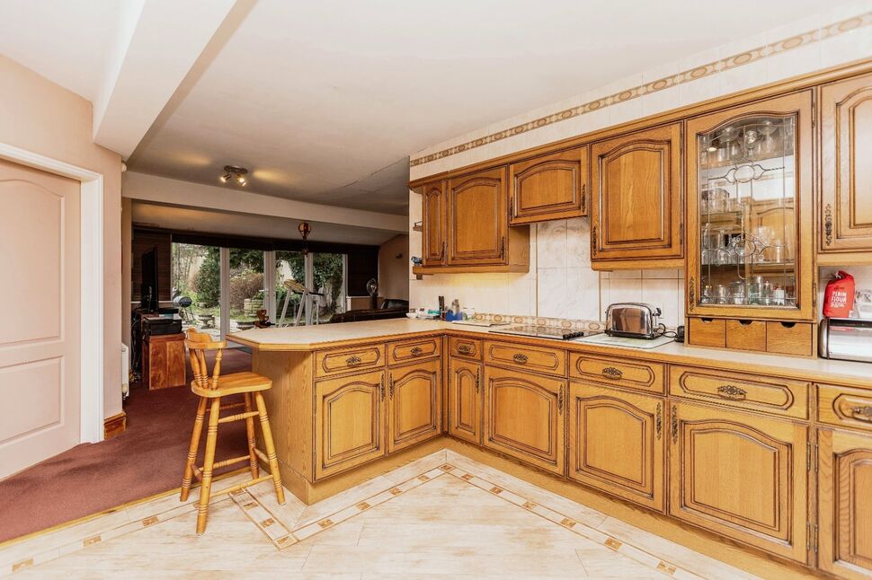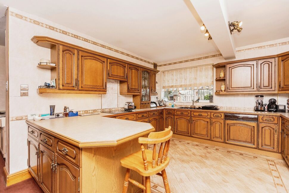Range of timber base and wall cupboard units with work top surfaces incorporating a sink unit with mixer tap. In-built electric oven and hob with extractor hood over. Integrated dishwasher and fridge/freezer. Cupboard housing the central heating boiler, central heating radiator, double glazed windows to the front and side and side entrance door.