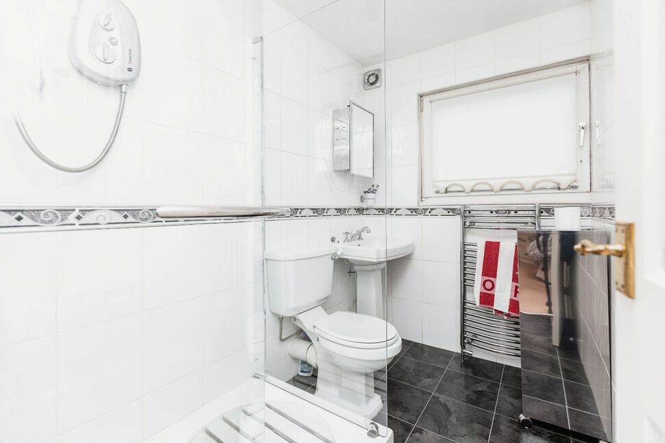 White suite comprising a corner bath with shower fitment to mixer taps, wash hand basin and low level flush W.C. Separate walk-in shower, central heating radiator, fully tiled walls and double glazed front window.