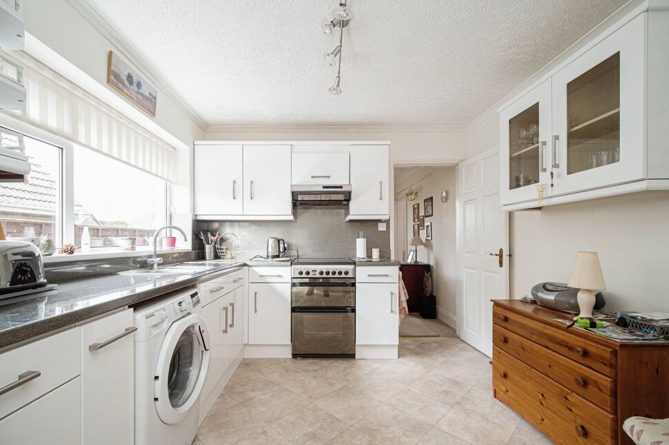 This superbly proportioned kitchen enjoys a side aspect double-glazed window. Superbly fitted with an excellent arrangement of white high gloss base and wall mounted cabinets comprising cupboards and drawers with complementing laminated work-surfaces and matching splashbacks. Inset one and a half bowl sink unit with mixer tap over. Freestanding cooker with extractor hood/canopy over. Spotlights and coving to ceiling. Radiator.