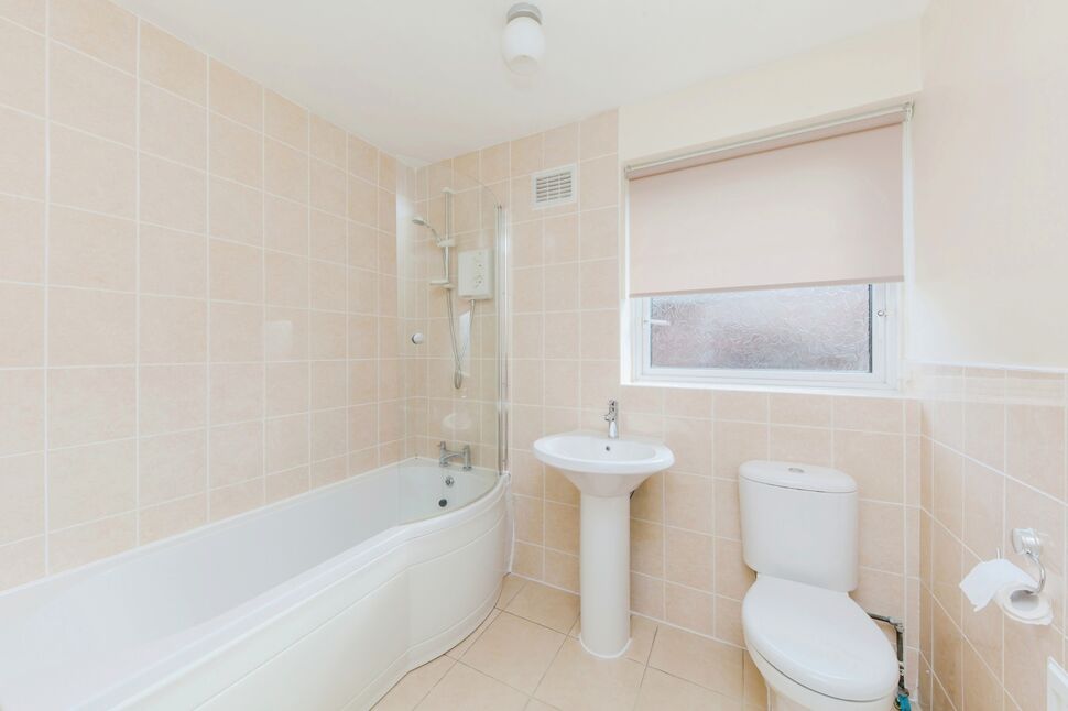 uPVC double glazed frosted window. Modern suite with a low level WC, wash hand basin and bath with shower above.