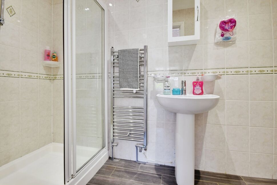 Modern fitted suite comprising 'P shaped' panelled bath with curved shower screen.Low level WC and wash hand basin. Fully tiled walls. Double Glazed window to side.