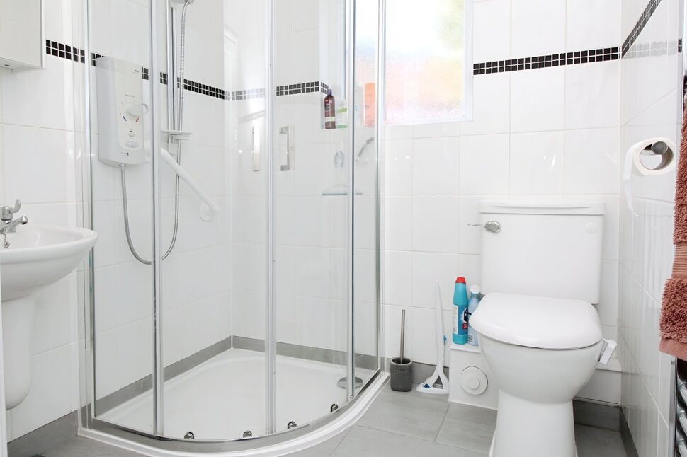 Having a low flush W.C, pedestal hand wash basin, corner shower unit with with electric shower unit overhead, tiled floor to celling, chrome heated towel rail, storage cupboard housing the gas central heating boiler, plumbing for washing machine, loft hatch access and a uPVC double glazed obscure window to the side.