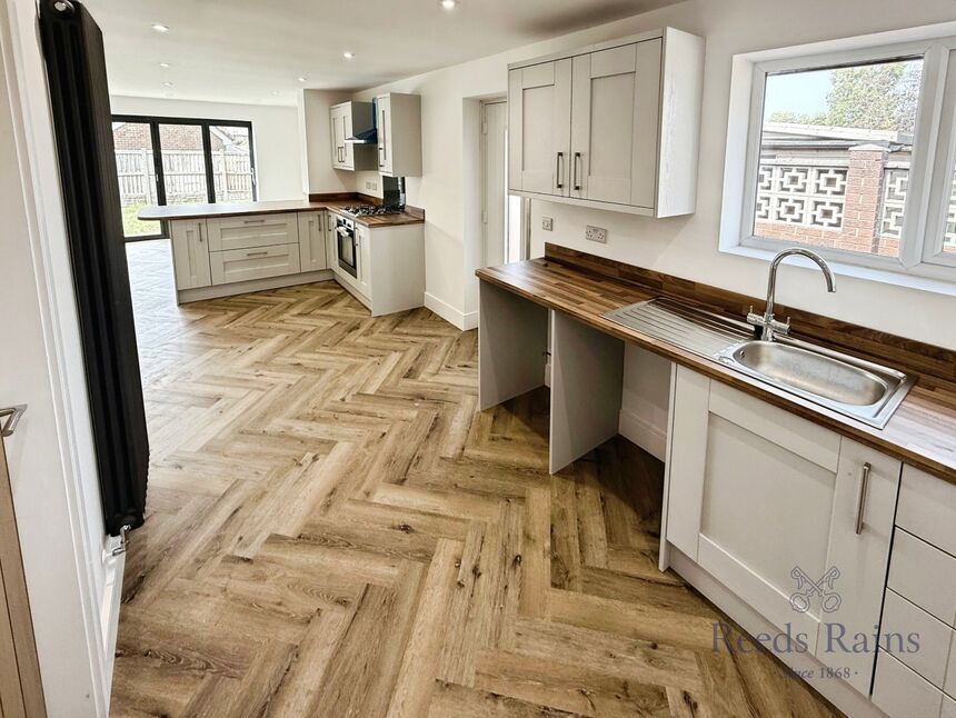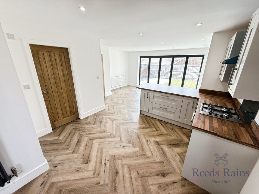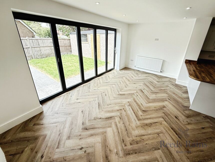The heart of this bungalow is undoubtedly the open-plan kitchen which is flooded with natural light. It features a convenient breakfast area, perfect for casual dining, and bifold doors that open out to the south-facing garden, creating a seamless indoor-outdoor living space.