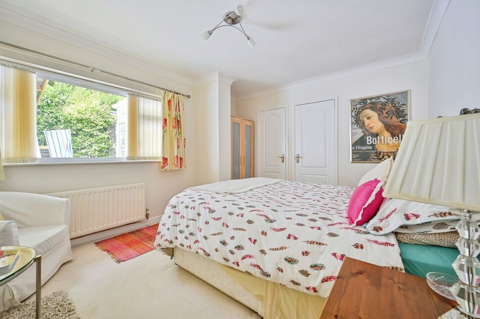 Bedroom four, though the smallest of the four, offers a spacious double layout perfect for guests or a cozy retreat. Featuring soft carpeting for added comfort and a south-facing window, this room invites natural light and beautiful garden views, creating a serene and welcoming atmosphere.