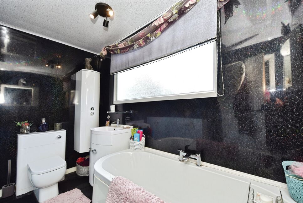 The bathroom is fitted with plastic splashbacks, a bath with shower over, wc, wash hand basin, a chrome heated towel rail and a front facing PVCu double glazed window.