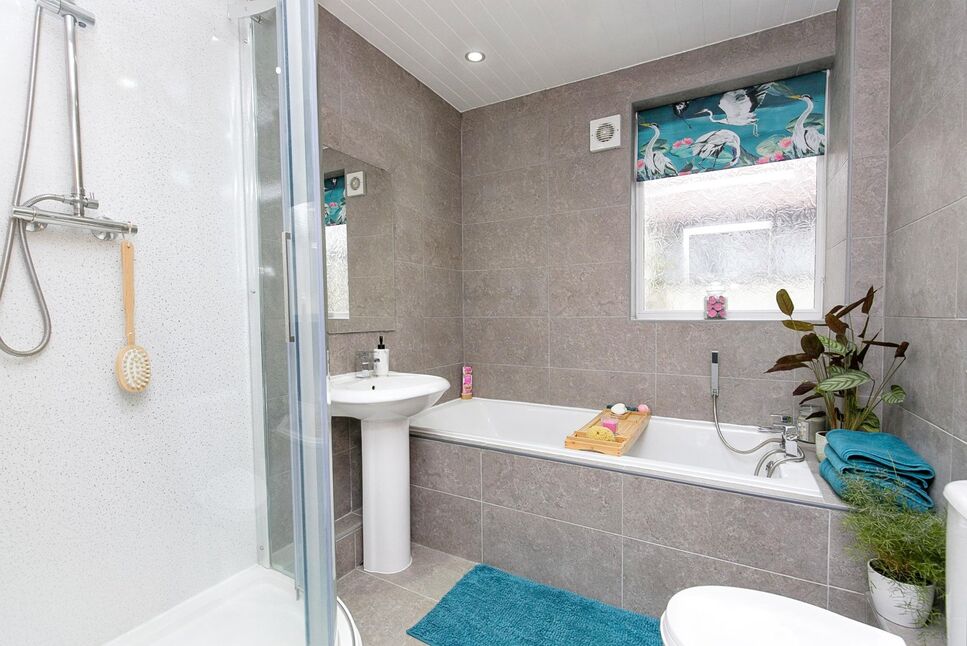 A four piece bathroom comprising of a low flush W.C, pedestal wash hand basin, bath with mixer tap and shower head, walk-in shower enclosure with shower unit overhead, chrome heated towel rail and a uPVC double glazed obscure window to the rear elevation.