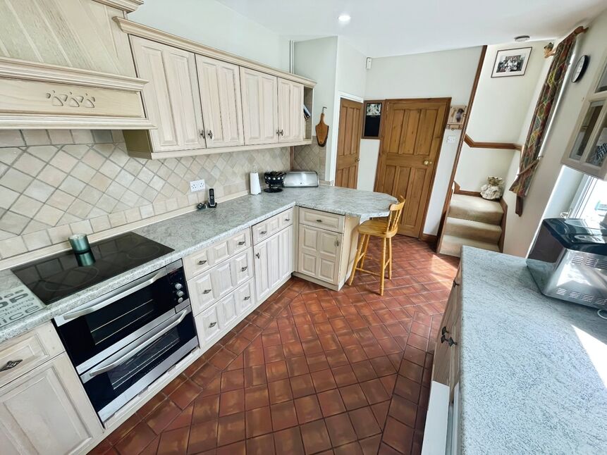 Range of base and wall units, worktops and drawers, electric oven, hob and extraction, stairs to first floor, under stairs storage, door leading to