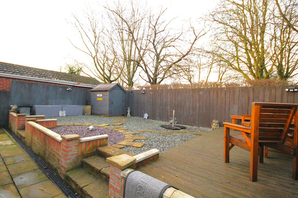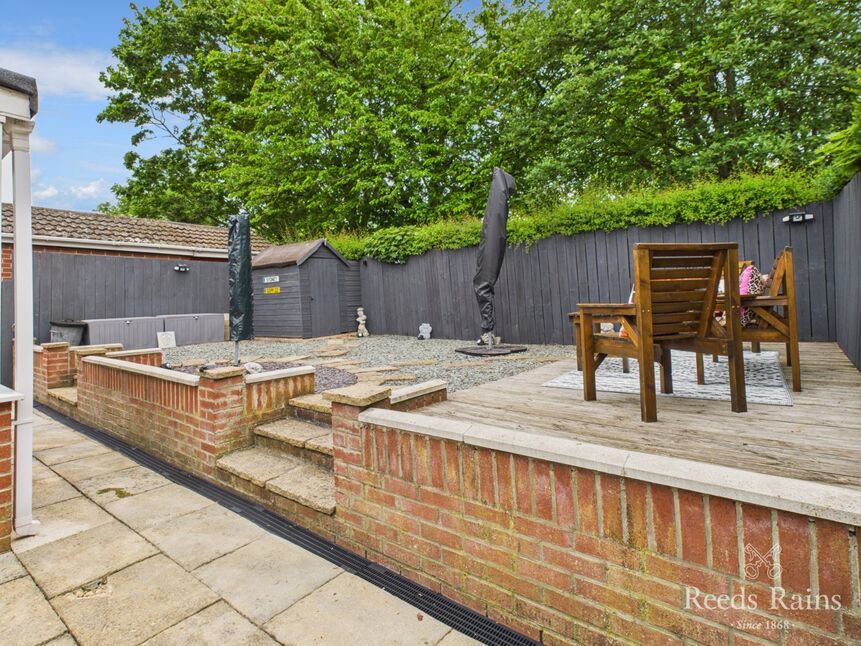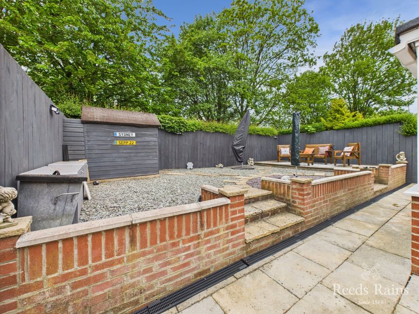 The front garden is open-plan with low-maintenance slate chippings and an imprinted driveway providing off-road parking and access to a storage area with a roller-door garage. Gated side access leads to the private rear garden, featuring a paved patio for alfresco dining, a garden shed, and a decking area. With no overlooking, this outdoor space offers complete privacy.