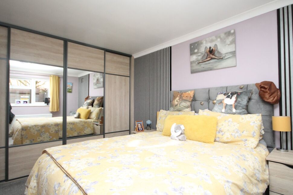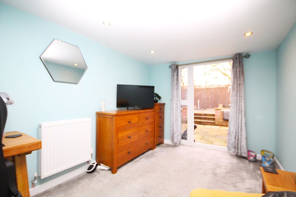 Over looking the serene rear garden, bedroom one offers a peaceful retreat. This tranquil space features stylish fitted wardrobes with sleek sliding doors, providing ample storage to keep your belongings organised and tidy. There's plenty of room for a double bed and additional furniture, making it a comfortable and functional haven for relaxation.