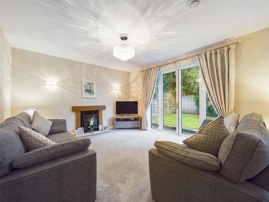 Positioned to the rear overlooking the garden. Glazed doors, a modern fireplace, wall lights.