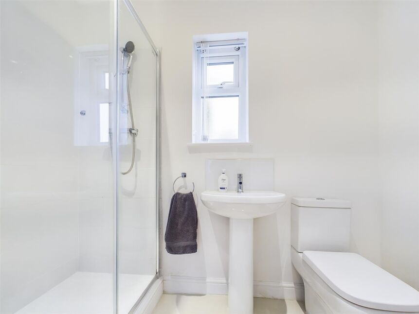 Fitted with a white suite, tiled flooring and splashback areas. Radiator. Walk-in double size shower, WC, wash hand basin. Window to the rear.