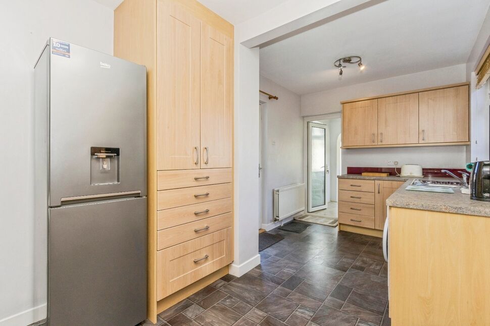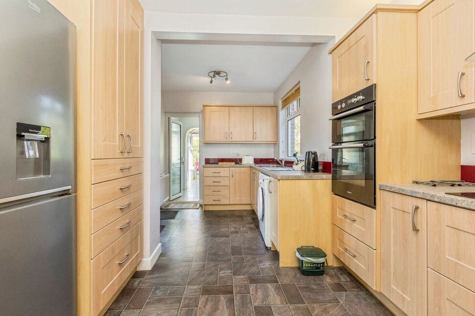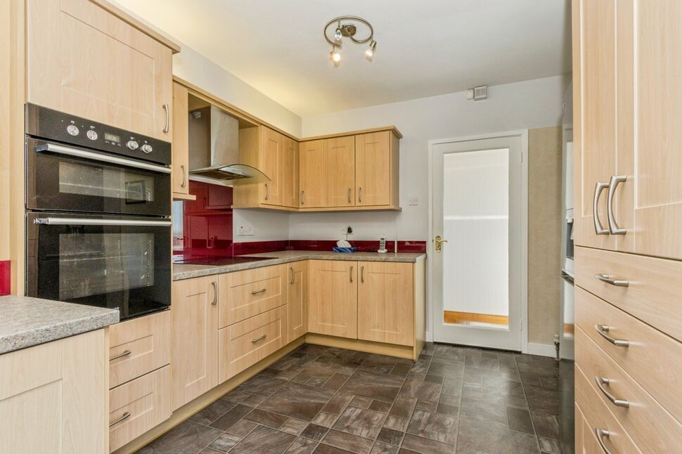 Fitted kitchen with an excellent range of high and low level units and laminate worktop. Double oven and 4 ring ceramic hob with stainless steel extractor fan. Plumbed for washing machine. Stainless steel single drainer sink unit with mixer tap. Laminate flooring. PVC door to rear and PVC door to conservatory.