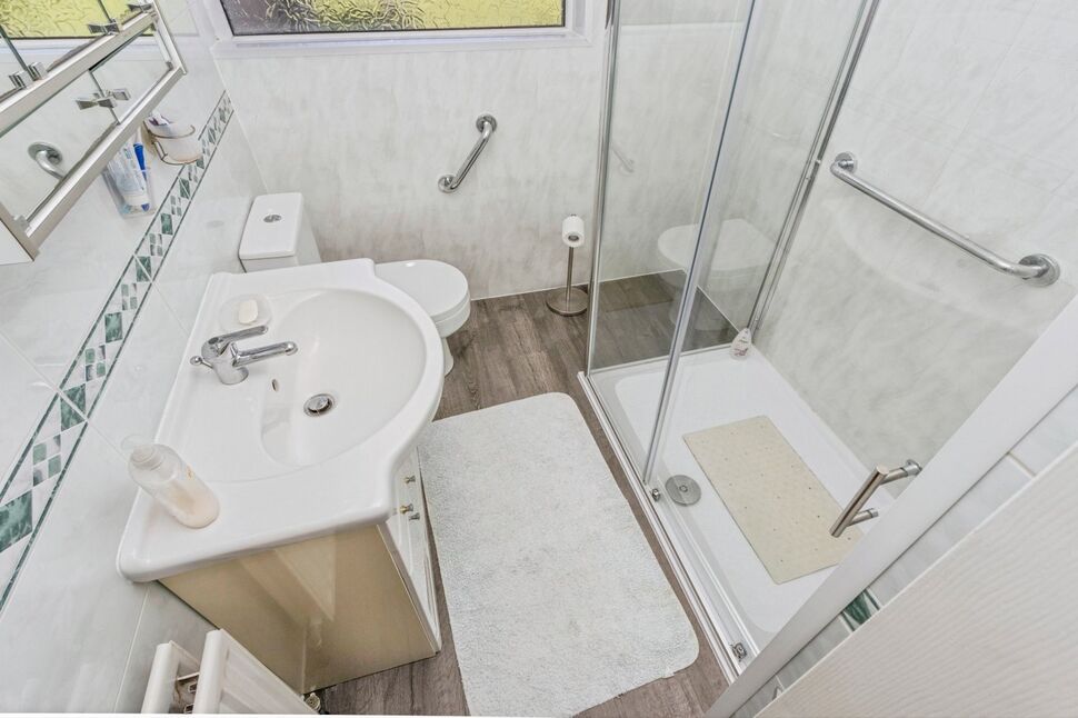 White suite comprising low flush WC, vanity wash hand basin with mixer tap and enclosed shower cubicle with electric shower. Laminate flooring, part tiled walls and part laminate wall panelling.