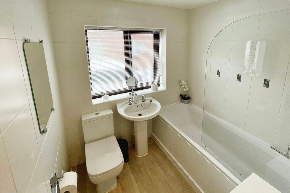 Neutral spacious tiled bathroom featuring bath with shower over, basin w/c and heated towel rail, upvc window.