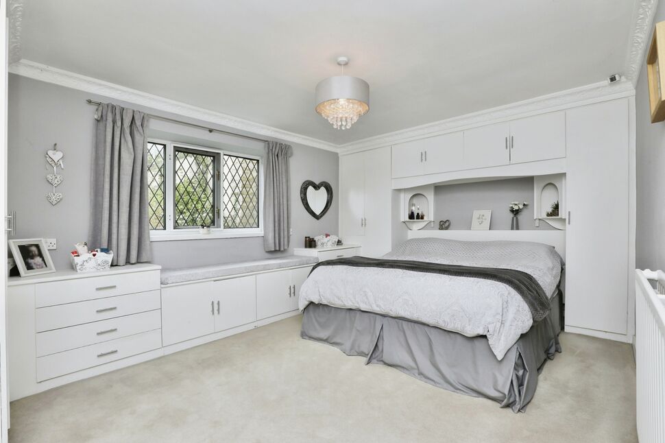 Good sized master bedroom with fitted carpet, central heating radiator, bespoke fitted wardrobes and drawers, access to the en suite shower room and side facing double glazed window.