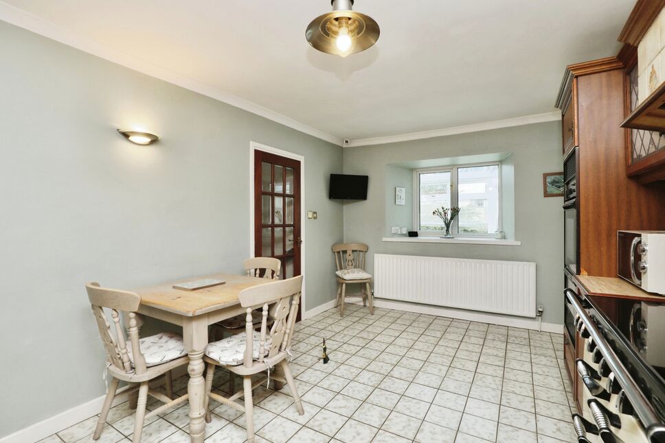 Briefly comprising; a range of matching eye level and base units, sink and a half with drainer and mixer tap, complimentary splash back tiling, integrated double electric oven, free standing Rangemaster cooker with cooker hood over, tiled flooring, dining space, central heating radiator, front and rear facing double glazed windows.