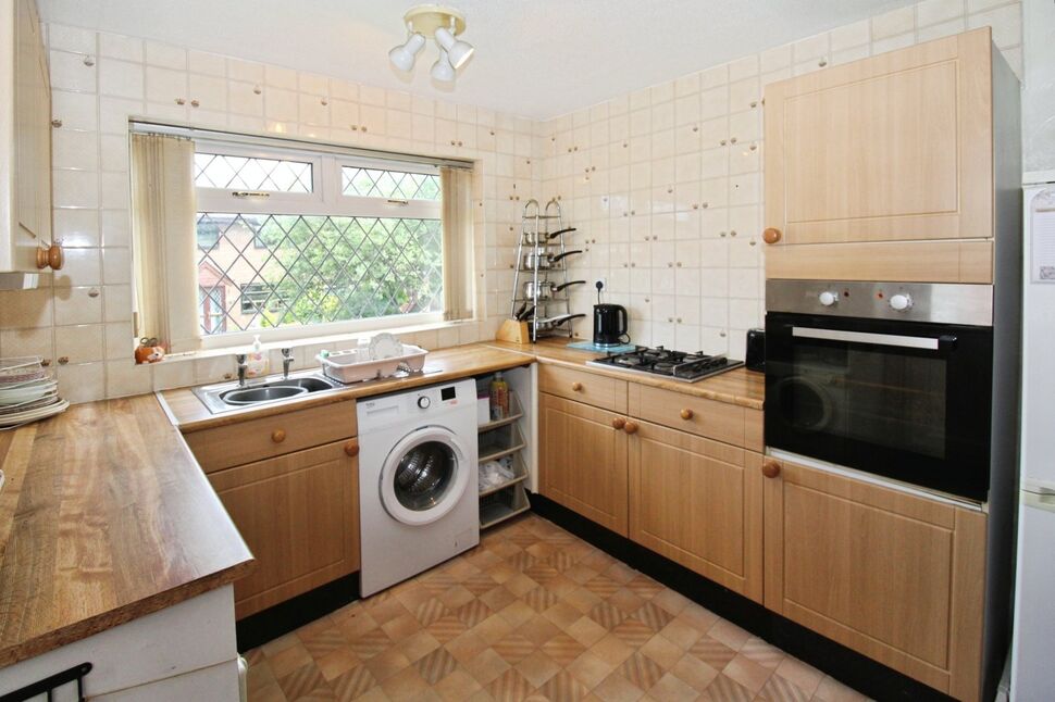 Double glazed window to front, double glazed door to side, matching wall and base units with work surfaces over, sink unit with mixer taps over, space for washing machine and tumble dryer, oven, hob and extractor fan over, radiator and space for dining table and chairs.