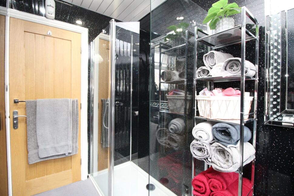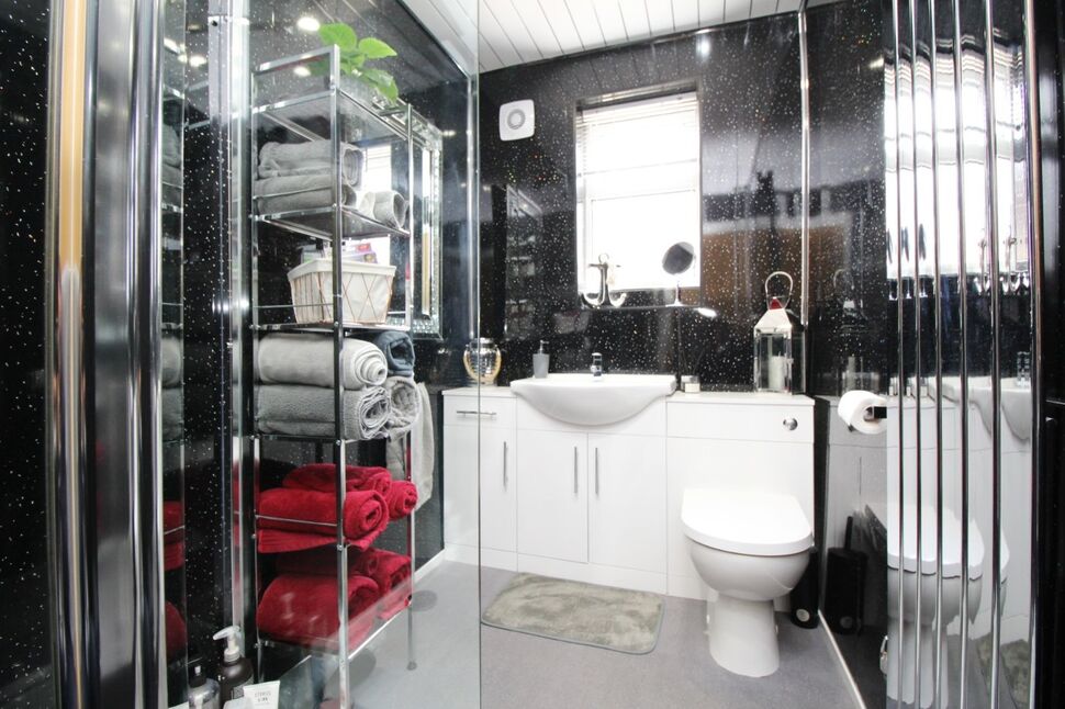 Comprising of a low flush W.C, vanity wash hand basin with storage under neath, good sized shower enclosure with shower unit overhead, panelled walls, heated towel rail, extractor fan, inset LED lighting and uPVC double glazed obscure window to the side.