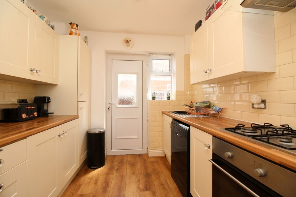 Fitted with a range of modern wall, drawer and base units with work top over, stainless sink with drainer, integrated oven with four ring gas hob and stainless steel extractor hood over, void for dish washer and free standing fridge freezer, tiled splash backs and power points, cupboard housing the Worcester gas combination boiler and a uPVC double glazed window and door giving access into the enclosed rear garden.