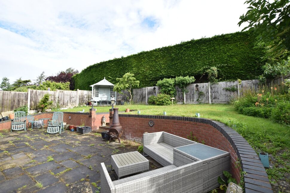 The rear garden is fully enclosed and mostly laid to lawn, with patio seating area and hedgerow surrounds.