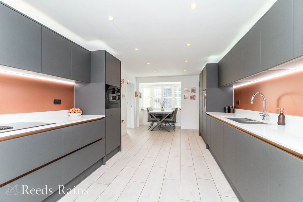 Front and rear facing double glazed bay windows. Range of modern wall and base units with Quartz worktop surfaces and two bowl sink unit with instant hot water tap. Two integrated electric ovens, microwave and electric hob with downdraught extractor. Large integrated fridge, wine fridge, and dishwasher. Two radiators. Tiled floor. TV point.