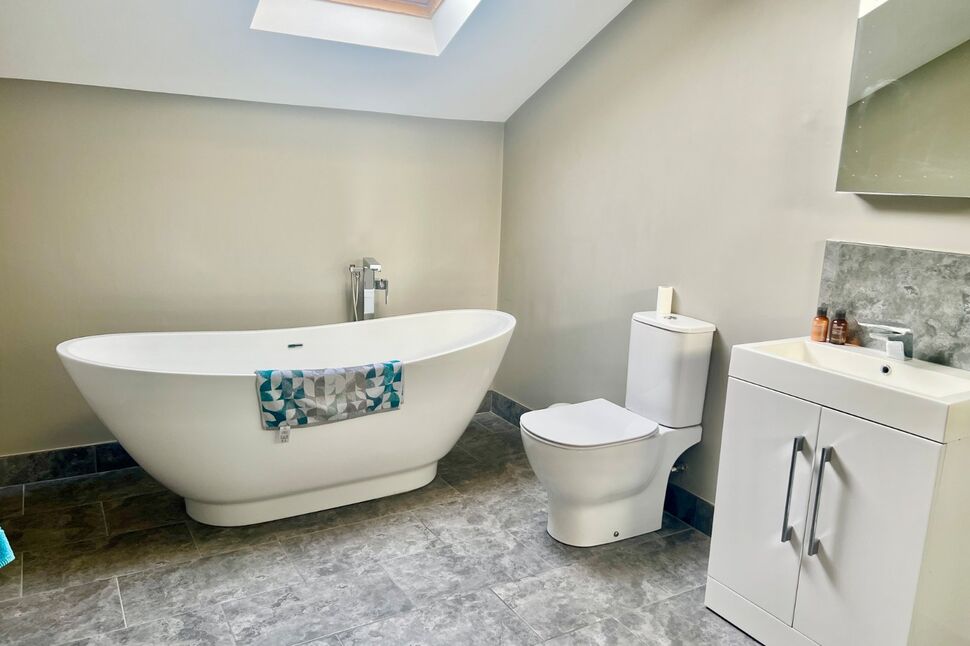Exceptional refitted family bathroom with slipper bath with hand held shower, wash hand basin and WC. Separate shower cubicle with shower and waterfall shower heads. Part tiled walls, tiled floor, radiator, skylight window.