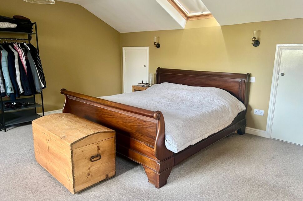 Fabulous main bedroom suite with window to the front, skylight window, radiator, two eaves store cupboards.