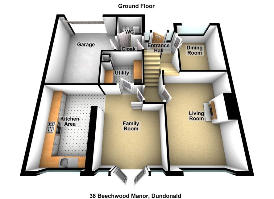 Solid wooden flooring. Walk in cloak cupboard with access to w/c and integrated garage.