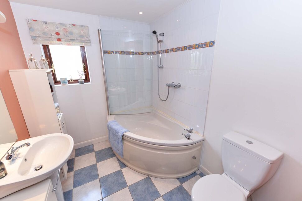 Comprising corner panelled bath with chrome mixer tap. Thermostatically controlled power shower unit with telephone hand shower. Pedestal wash hand basin with chrome dual mixer tap. Dual flush w/c. Partly tiled walls. Recessed spotlighting.