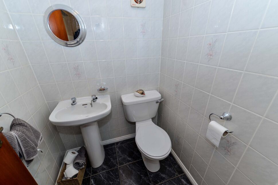 Pedestal wash hand basin with chrome mixer tap. Fully tiled walls. Extractor fan.