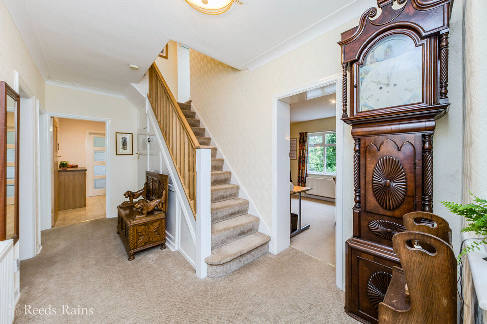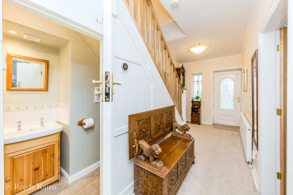 UPVC double glazed entrance door. UPVC double glazed window. Radiator. Staircase with oak banister. Panelling and useful storage cupboard.