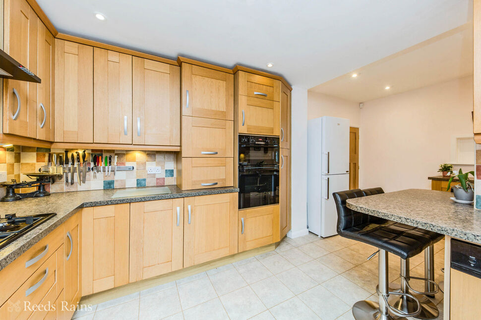 Fitted range of base, wall and drawer units with work surface incorporating a stainless steel dual bowl single drainer sink unit with mixer tap. Tiled splashbacks. Integrated four ring gas hob with extractor hood above. Built in oven and grill. Integrated dishwasher. Integrated fridge. Breakfast bar seating several. Radiator. Inset down lighting. UPVC double glazed French doors looking and leading out onto the garden. Karndean flooring.