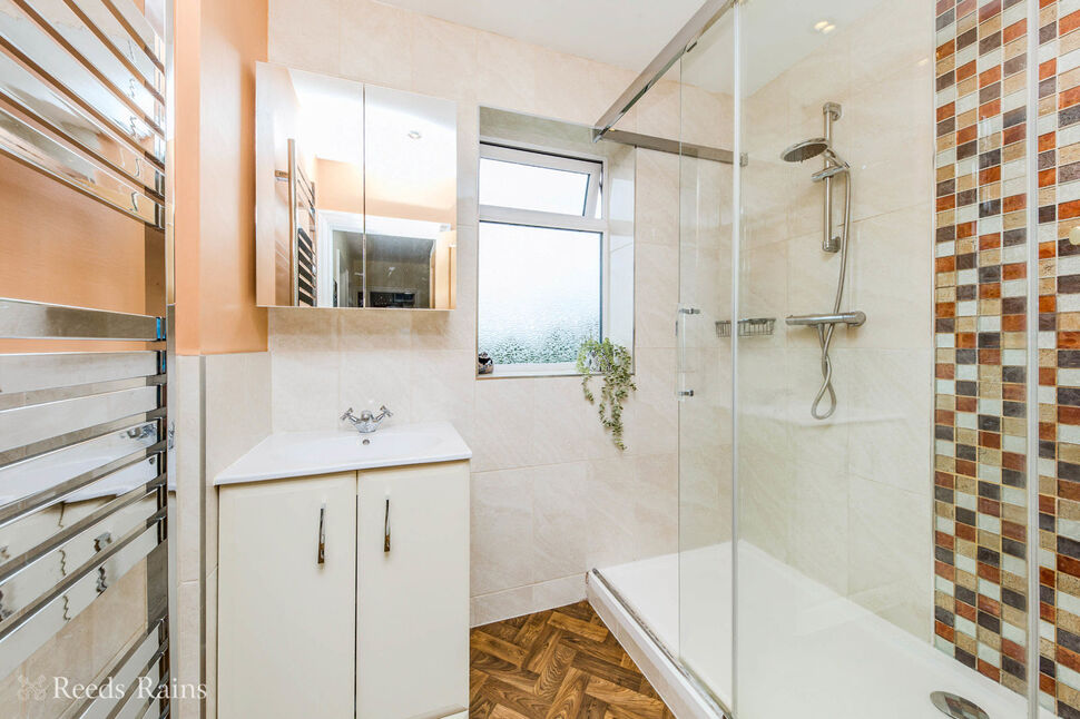 Large walk in dual shower area with glazed screen and two wall mounted shower units. Wash basin. Part tiled walls. UPVC double glazed window to the rear. Heated towel rail. Inset down lighting. Extractor.