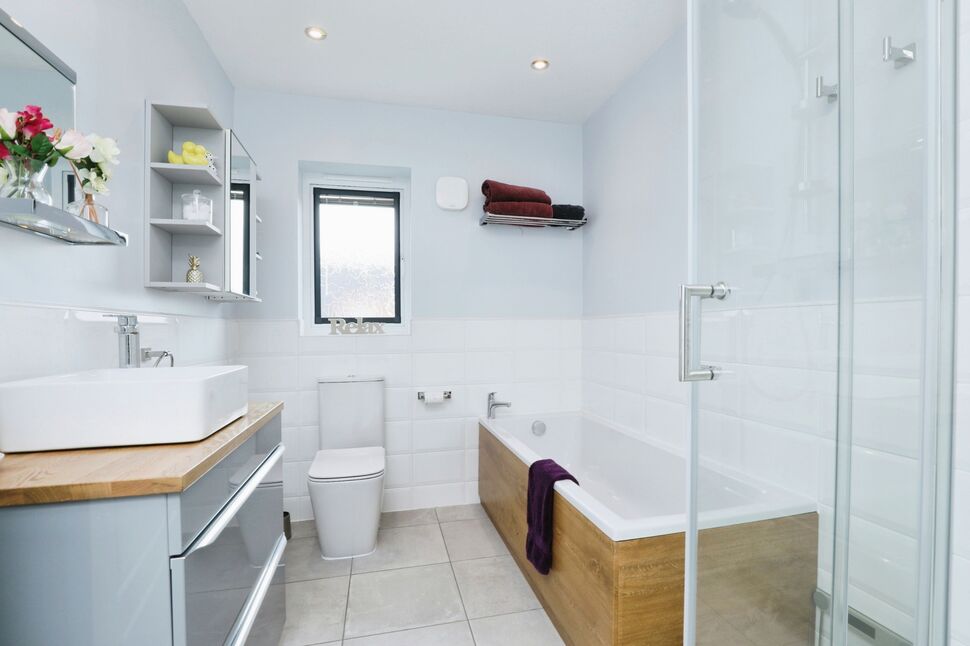 Benefitting from both bath and separate shower cubicle, wall mounted hand wash basin with vanity unit below, w/c, half tiled walls, central heating radiator, wall mounted mirror storage unit, spotlights to the ceiling, extractor fan, tiled flooring and rear facing double glazed obscure window with fitted blinds.