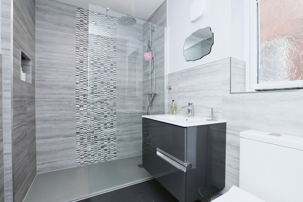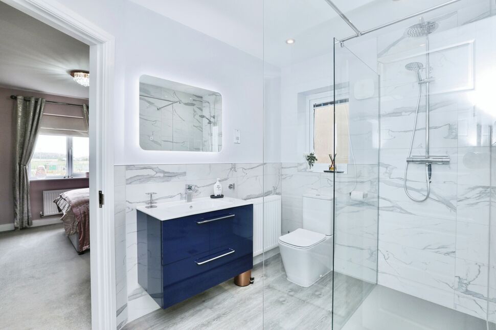 Access via bedroom two and three briefly comprising; walk in double waterfall shower and shower head, wall mounted free standing hand wash basin with vanity unit below, w/c, splash back tiling to the walls, wall mounted LED touch mirror, shavers point, tiled flooring, spotlights to the ceiling, central heating radiator and side facing double glazed obscure window.