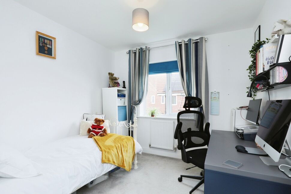 Fitted carpet, central heating radiator and rear facing double glazed window with made to measure roman blinds.