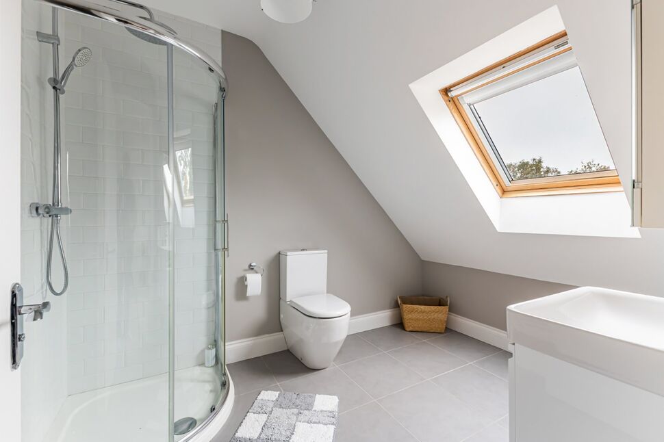 Fully tiled built-in shower cubicle with fixed overhead shower and body spray, vanity unit with mixer tap and tiled splash back, ceramic tiled floor, Velux window.