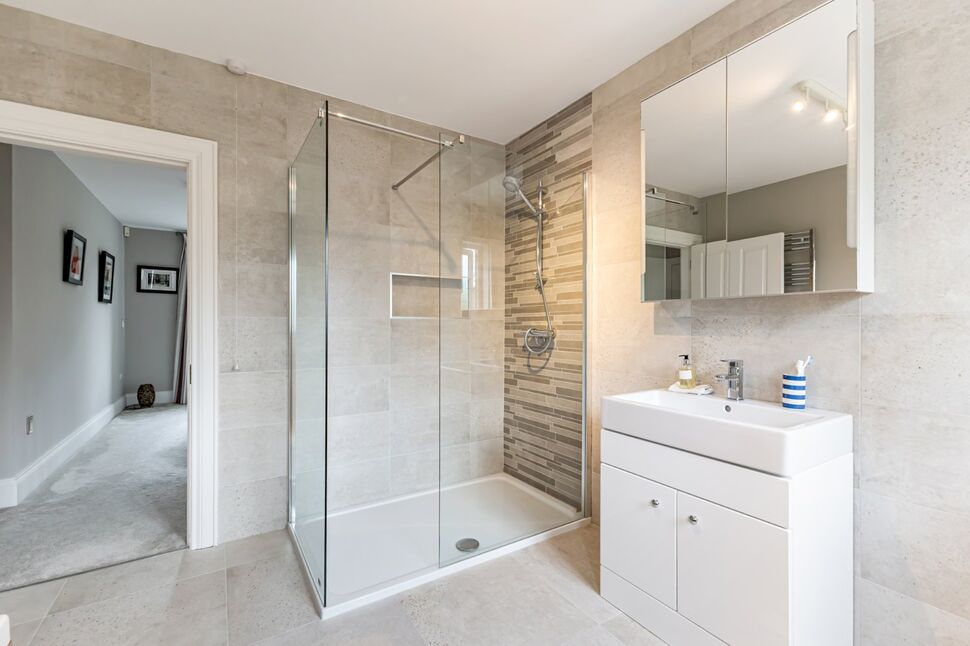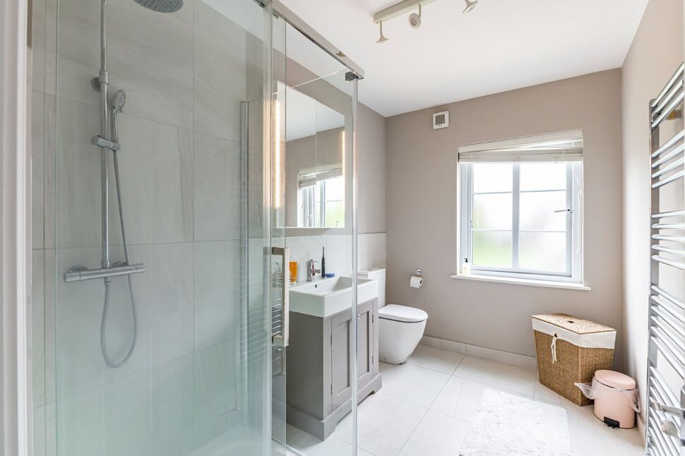 Fully tiled built-in shower cubicle with overhead shower and body spray, vanity unit with mixer tap, low flush wc, part tiled walls, ceramic tiled floor, heated towel rail.